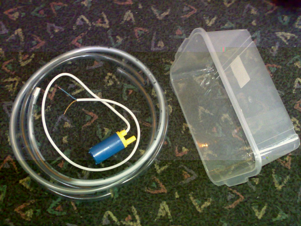 Zuerst Schlauch und ein Behältnis besorgt. Die kleine Tauchpumpe ist für den ersten Test gut genug. Sie schmeist enorm viel Wasser durch (900l/std.) und baut bis zu 1bar Druck auf (10m Förderhöhe). Solche Werte werde ich hier wohl gar nicht benötigen. Allerdings ist sie bei voller Spannung auch ganz schön laut und darf dann nicht 100% eingeschaltet bleiben.