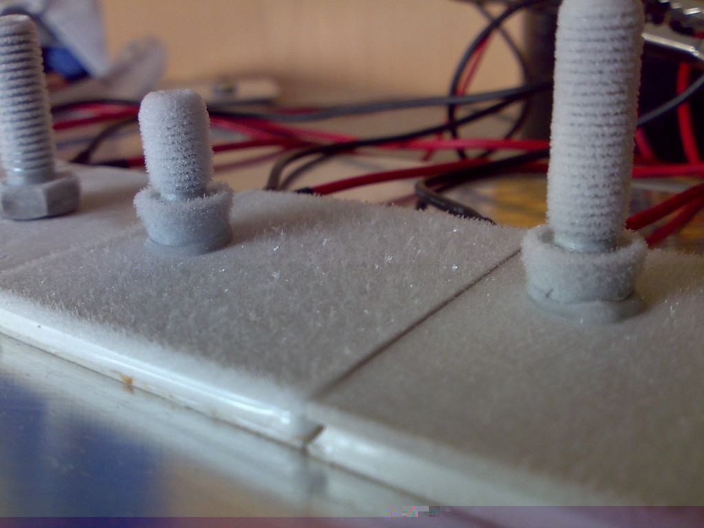 Immer und immer wieder habe ich mit Peltierelementen rumgespielt, und irgendwann konnte ich dank etwas größerer CPU-Kühlkörper auch mal in den Minusbereich kommen. Ziemlich bald fiel mir dann auch auf, dass Kondenswasser aus der Luft an der kalten Seite friert.