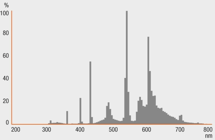 Darunter das Spektrum einer Leuchtstoffröhre. Das Spektrum weist erhebliche Lücken auf. Die Spitzen im Spektrum sind aber so geschickt verteilt, dass das Messverfahren einen Wert von >90 Ra liefert. Auch fürs Auge ergibt sich so eine gute Farbwiedergabe. Allerdings wird es aufgrund der Lücken nahezu unmöglich, in bestimmten Bereichen feinste Farbnuancen zu unterscheiden.
