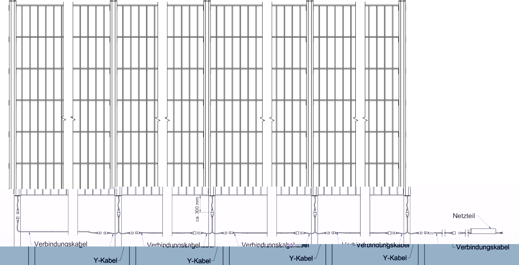 Um noch mal auf die Zeichnung einzugehen. Ich habe 8 Pfosten und in der Mitte ein Trafo und einen Controller.