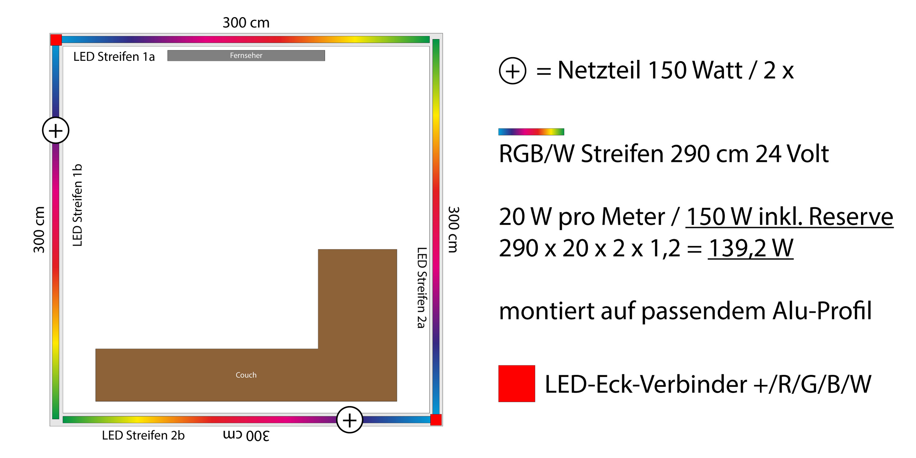 Okay, das klingt schon mal gut. Siehe Zeichnung 1, da sieht man die beiden Netzanschlüsse bzw. Zuleitungen, da sollten auch die beiden Netzteile hin. Die von mir ausgesuchten sind schön flach, für Möbel geeignet, wenig Wärmeentwicklung. Zudem wollte ich in dem Trockenbau-Koffer, der innen ca. 6 x 6 cm Platz hat, eine kleine Konstruktion unterbringen, auf der ich dann die LEDs in den Alu Profilen platziere. Darunter wäre dann Platz für die Netzteile gewesen und für den Fibaro Controller. Wo der übrigens sitzt ist egal, der läuft über Z-Wave Netzwerk, wäre also flexibel. Sofern ich aber für alles genügend dickes Kabel verwende, könnte ich die Netzteile auch woanders platzieren und den Strom verteilen, das wäre mir vollkommen egal, Hauptsache ich bin safe. Der Controller verträgt übrigens 6 Ampere pro Kanal, 12 Ampere insgesamt, das nur als Info. Hier wären die vollständigen Informationen: https://manuals.fibaro.com/rgbw-2/