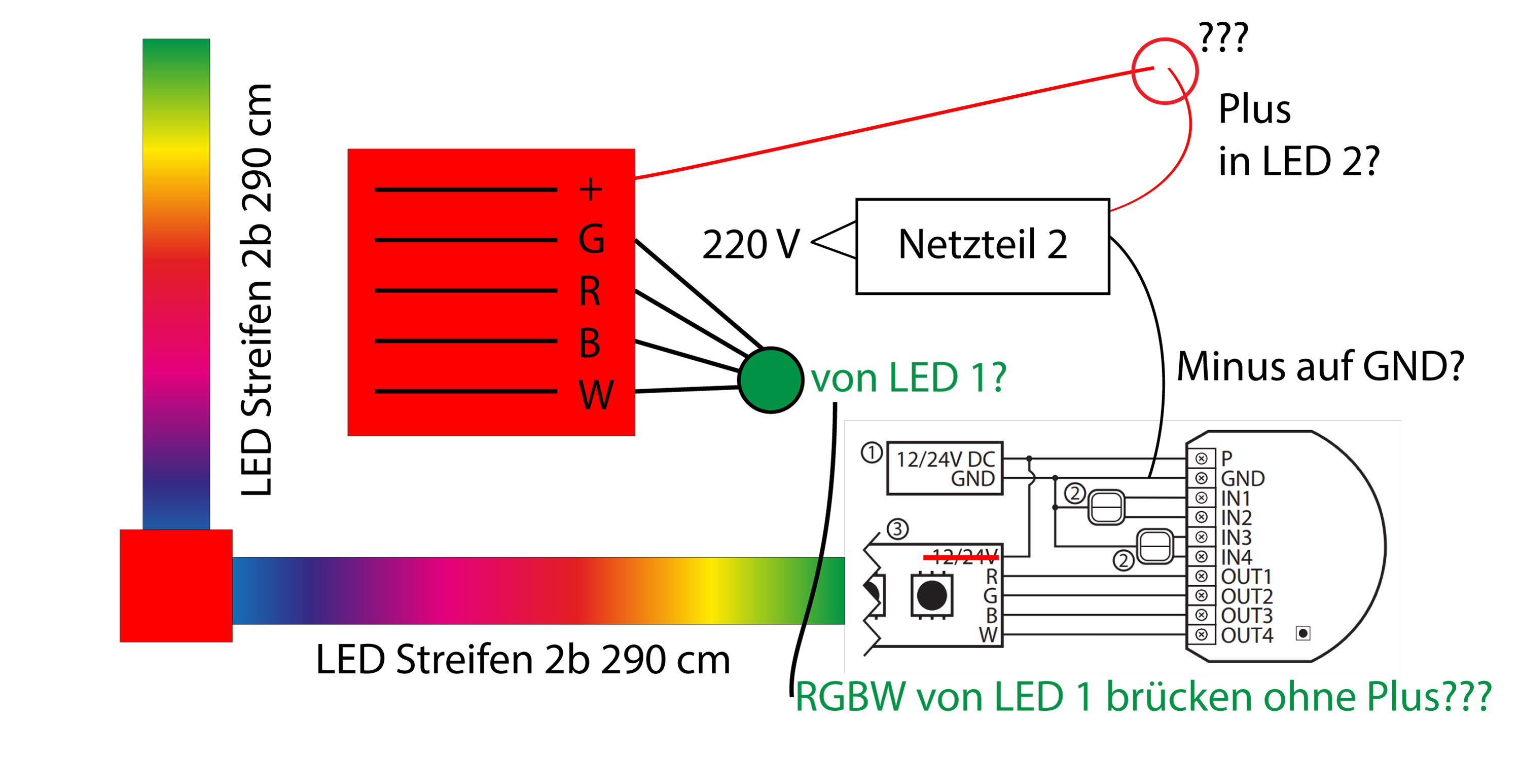 3. Verbinde ich dann einfach LED-Streifen 1 und LED-Streifen 2 mit einer Brücke und nur RGBW, damit der Controller das ebenfalls steuert, lasse aber Plus natürlich weg (kommt ja von Netzteil 2)? Geht das?