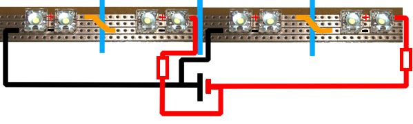Die Parallelschaltung hat dann noch den Vorteil, dass im Fehlerfall nur eine LED ausfällt, in der 4er-Reihe fallen gleich 4 LED´s aus.