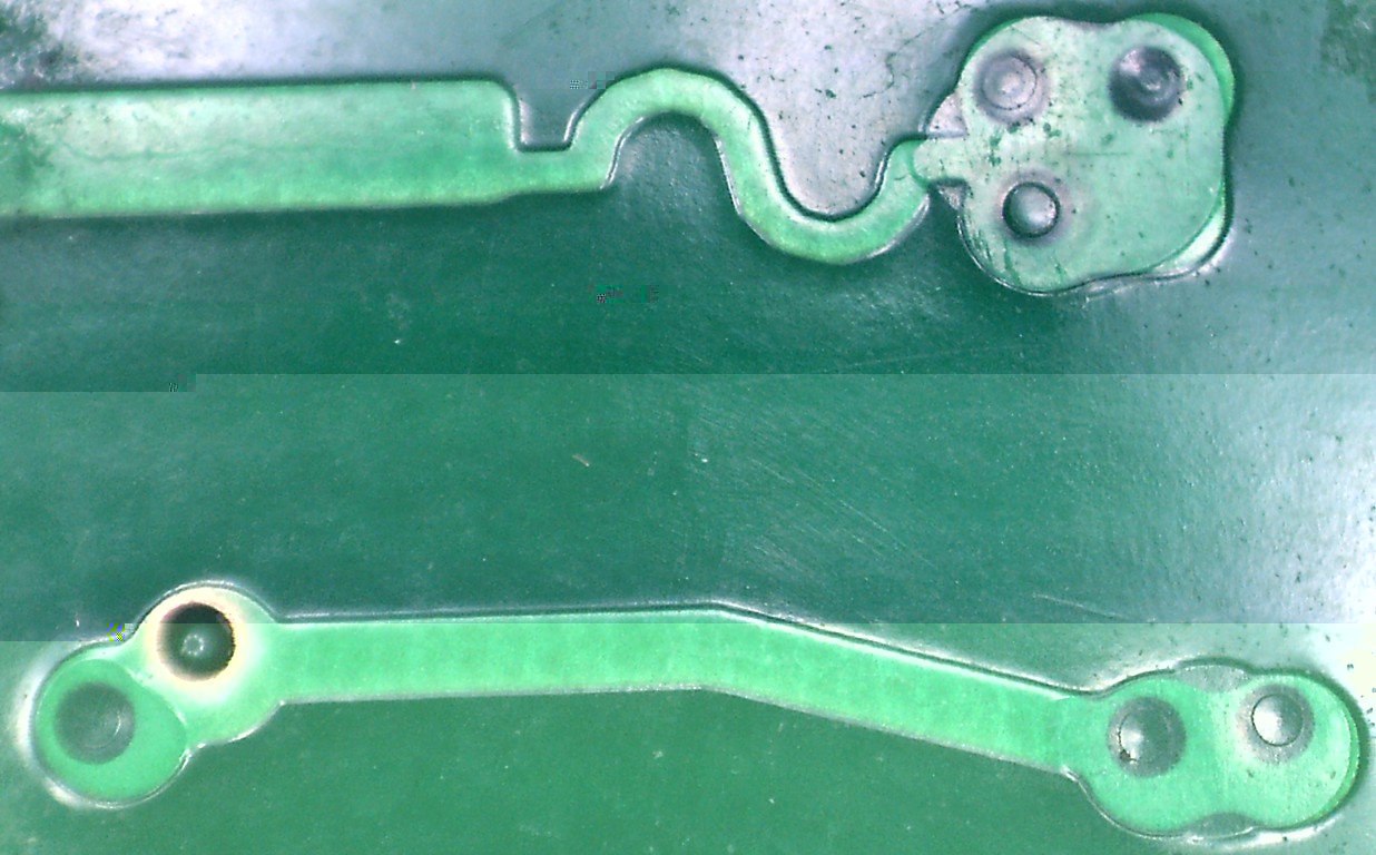 Ist auf den Makroaufnahmen mit der Digitalkamera nur schwer (oder garnicht) zu erkennen. Achim hat aber recht, es sind Durchkontaktierungen. Hier nochmal eine Detailaufnahme mit meinem USB-Mikroskop: