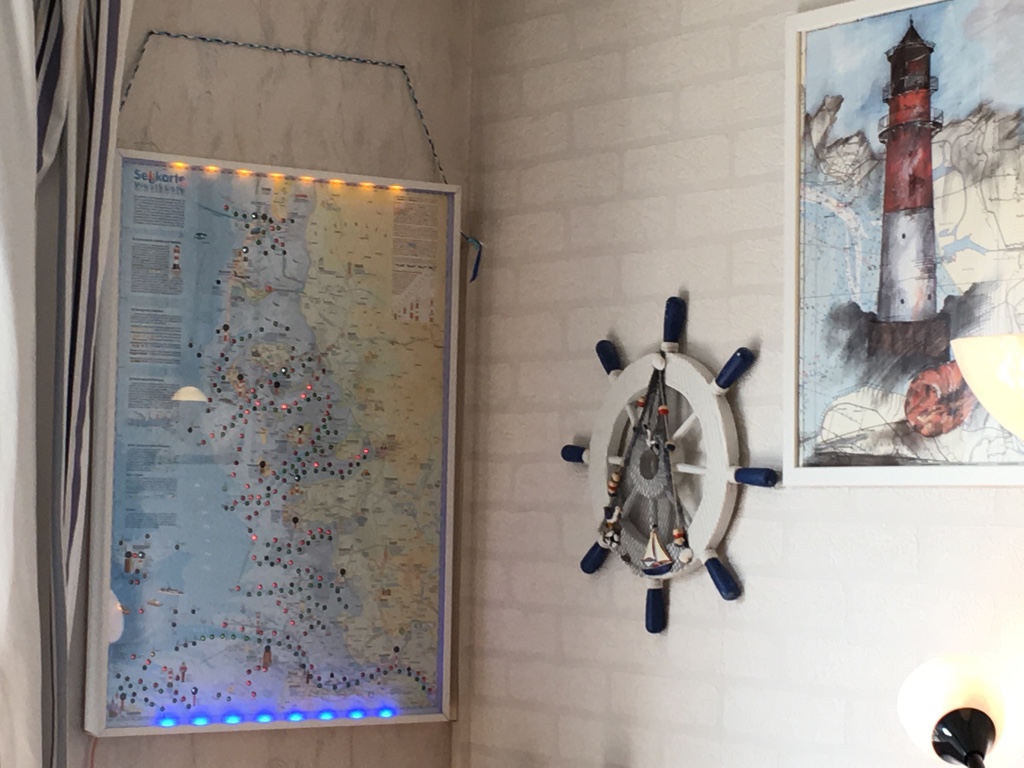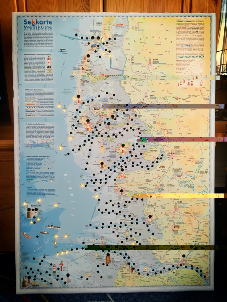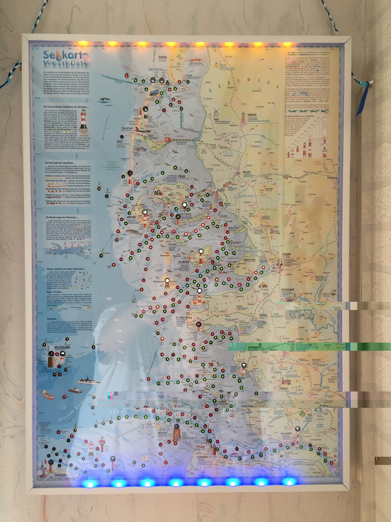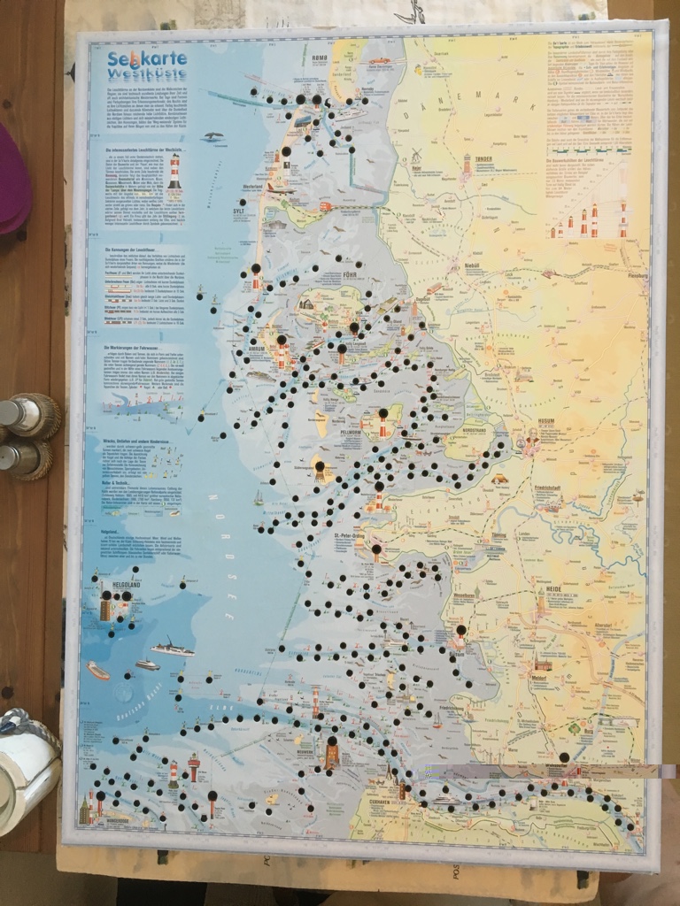 Heute ist meine illuminierte Seekarte mit den Leuchttürmen der Schleswig Holsteinischen Westküste soweit fertig geworden. Viel zu lange habe ich so eine ähnliche Karte an der Nordsee in den Läden hängen sehen. Es werden dafür allerdings Preise zwischen 600 und 800 Euro verlangt.