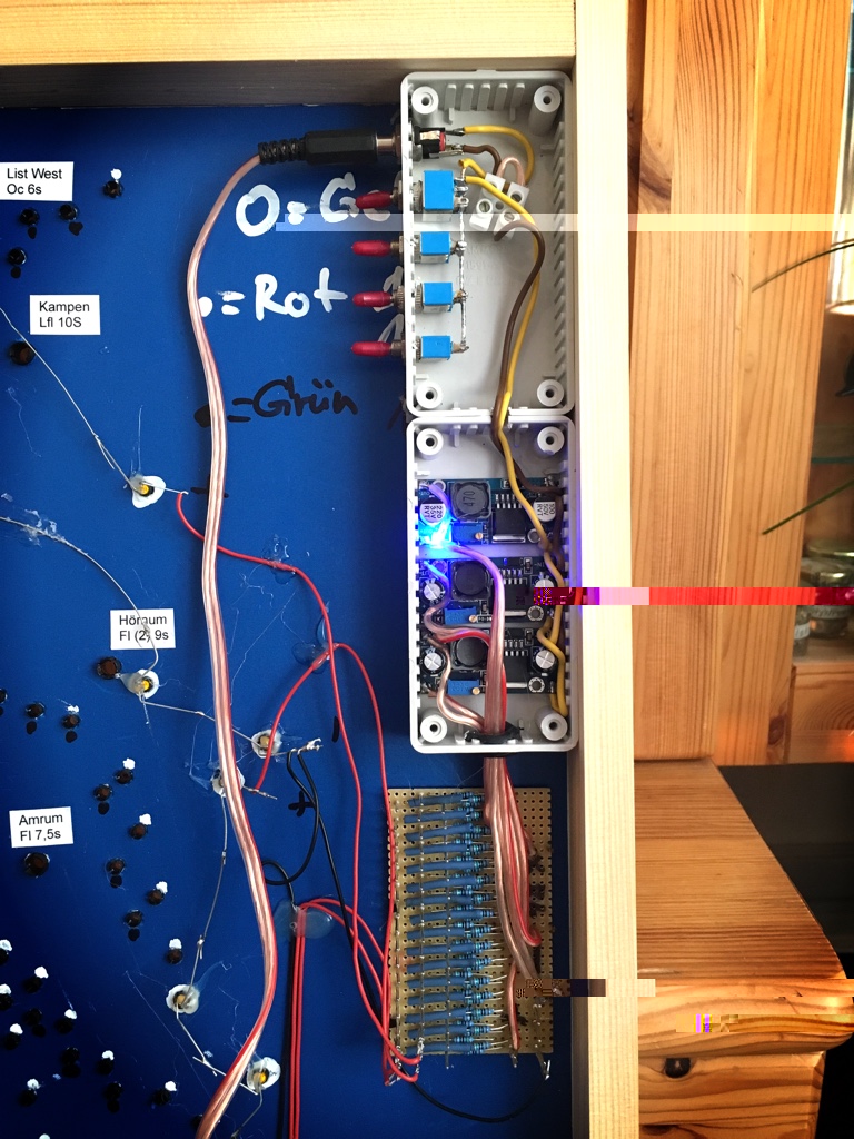 Ich habe habe nur 100 Euro benötigt. Knapp 300 Leuchtdioden (LED´s) symbolisieren Seefahrstraßen und Markierungen. Die roten und grünen LED´s sind die Fahrstraßenmarkierungen. Die gelben LED´s markieren zum Beispiel Hindernisse, Schiffwracks oder sonstige Gefahrensstellen auf See. Sie leuchten alle permanent.