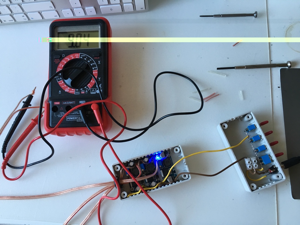 Es ist möglich den Arduino über ein USB Kabel zu programmieren. Die Stromversorgung der LED´s habe ich über 3 Step Down Wandler realisiert. Jede LED Farbe ist an einem eigenen Step Down Wandler angeschlossen. Somit ist es mir möglich jede Farbe individuell zu dimmen und in der Helligkeit den anderen Farben anzugleichen.