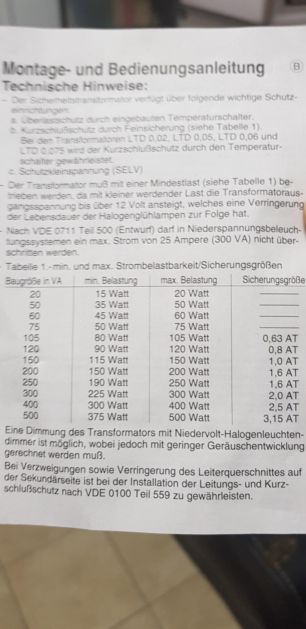 Zunächst zu den Grundsätzlichen Infos. Es geht um Hallogendeckenspots G4 in Parallelschaltung, die Leuchtmittel möchte ich nun gegen LED (AC/DC, 10-10V, 3W) tauschen. Der Sicherheitstransformator der Firma Nobile (mehrere LTD 200 und 105) gibt eine relativ hohe Mindestlast an, die mit 3W LED natürlich weit unterschritten wird.